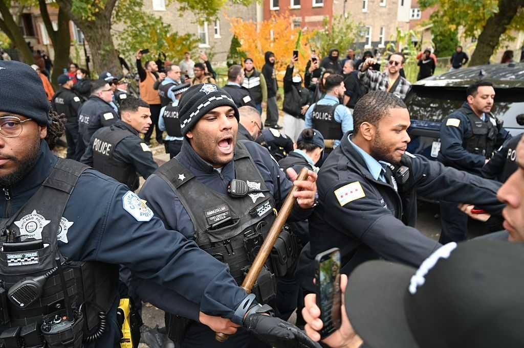 Some in the crowd reportedly hurled objects, including bricks, at the officers’ vehicles.