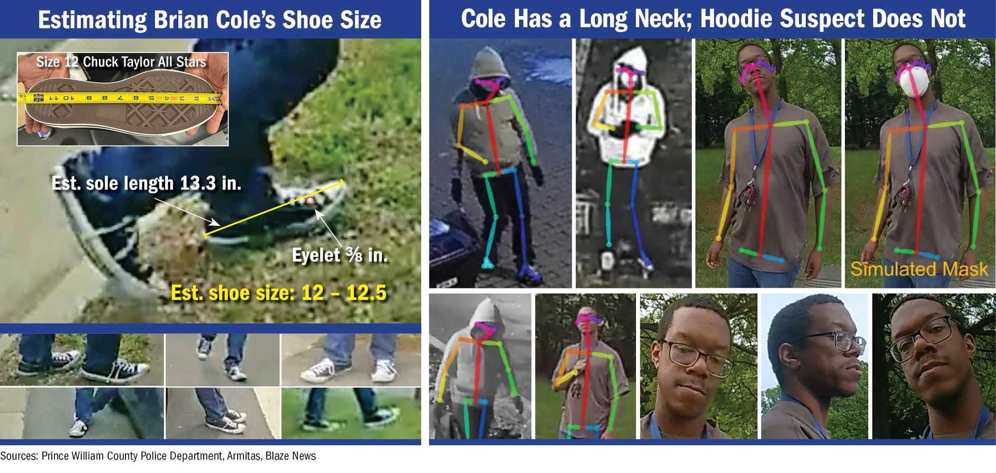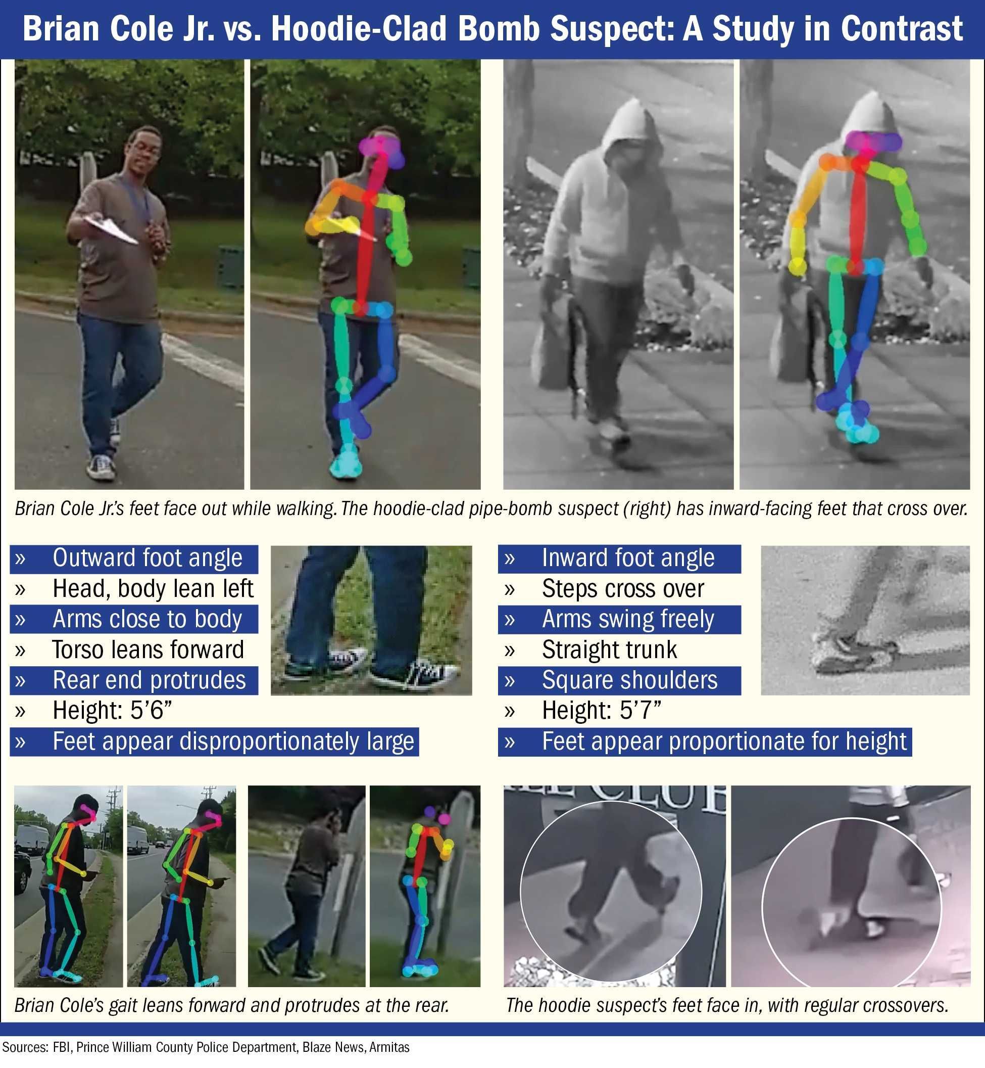 Blaze News analyzed video of the hoodie suspect released by the FBI, photographs and video of Cole, and evidence culled from independent investigations. This analysis indicates stark physical differences between Cole and the hoodie suspect, including the manner of walking, body shape and features, eyesight, shoe size, neck length, and mannerisms.