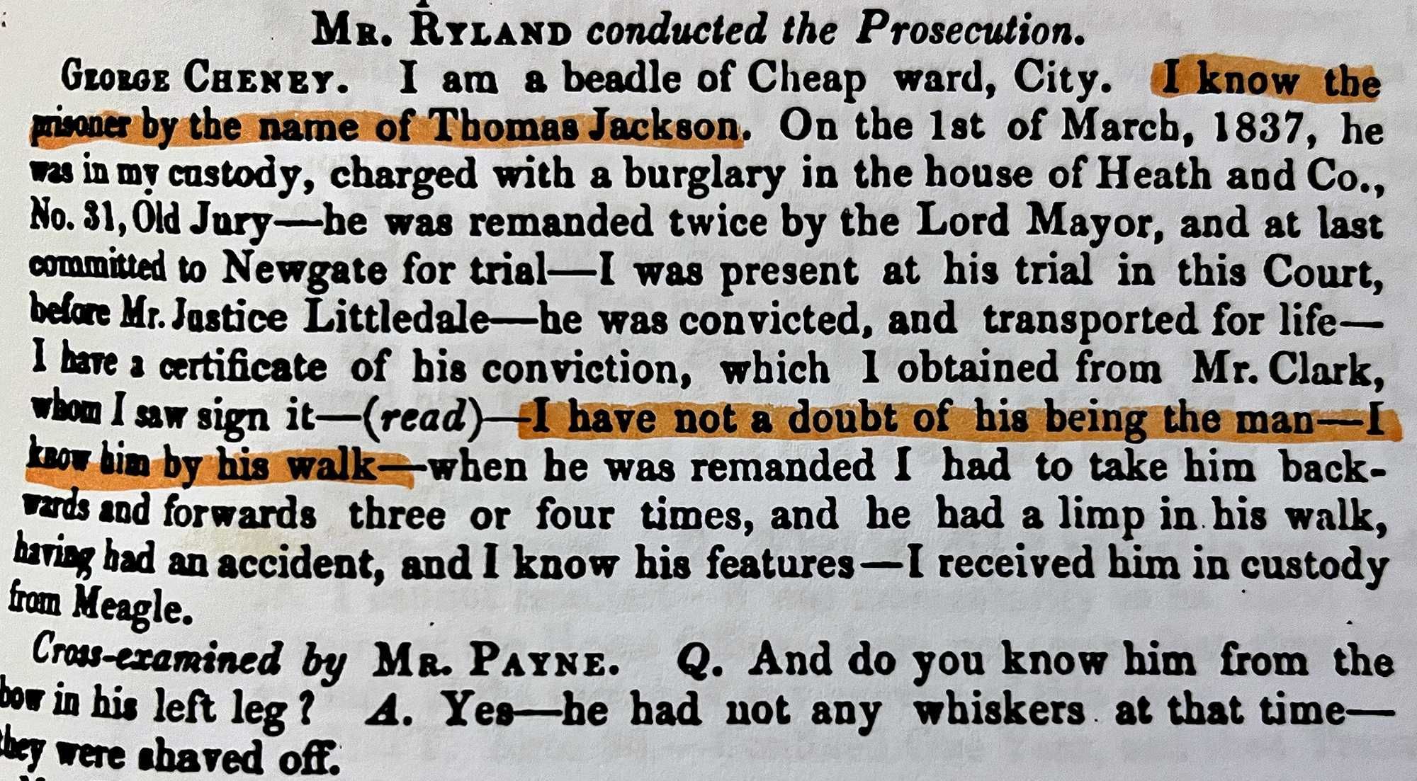 “I have not a doubt of his being the man — I know him by his walk,” Cheney said in court testimony. “When he was remanded, I had to take him backwards and forwards three or four times, and he had a limp in his walk, having had an accident, and I know his features.”