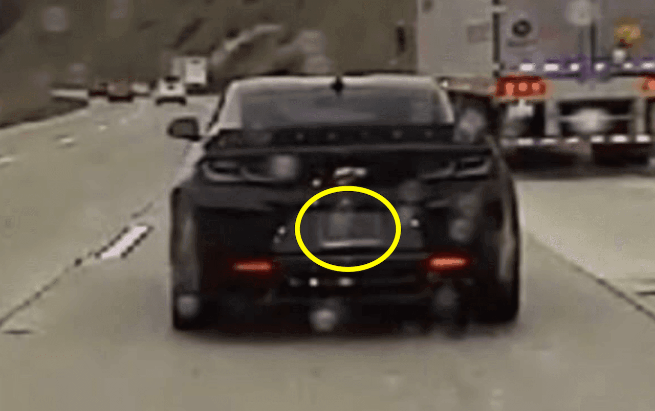 The officer observed the car "traveling at speeds exceeding 100 miles per hour," the CHP said, adding that it had a license plate that was "black with yellow or white writing."