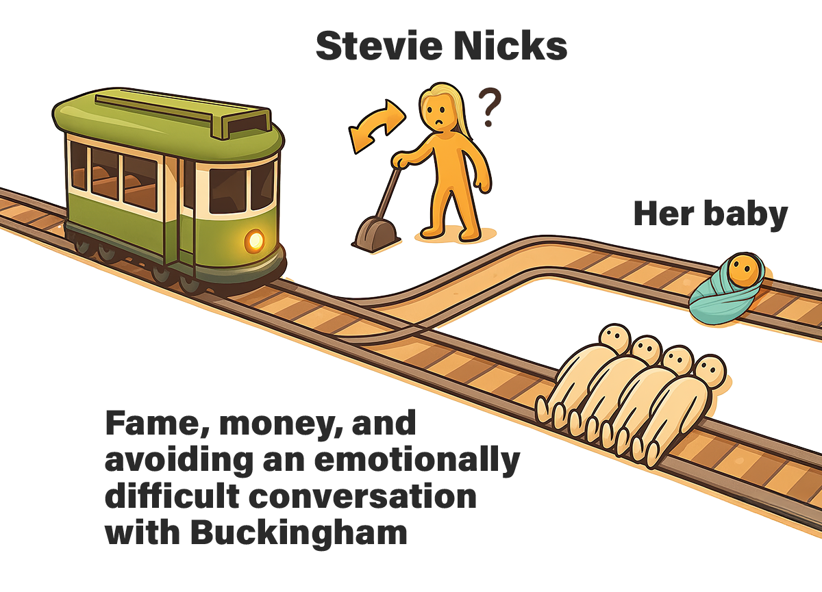 Philosophers use the “trolley problem” hypothetical to explore moral choices — sacrificing one life to save others from a runaway trolley. Nicks faced her own real-life version. One track held her child’s life; the other, her fame and comfort. She threw the switch. An innocent child died. Her fame soon followed.