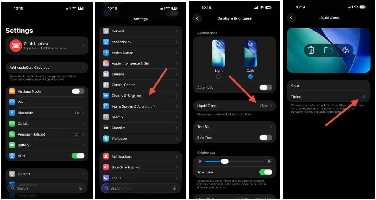 The new feature is called Tinted Liquid Glass. To enable it, open the Settings app on your iPhone. Scroll down to Display & Brightness and tap into the next pane. From there, find the Liquid Glass section. The default option is Clear mode, but you can change it over to Tinted with a couple taps. Follow the red arrows: