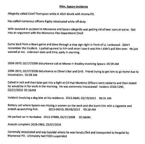 The "Ptlm. Spears Incident" document, likely drawn up by Manteno PD, also alleged Spears had called his police chief "while in a ditch drunk," had "called numerous officers highly intoxicated while off-duty," and even that he had his firearm owner's identification "suspended" at an unknown date and time after he was transported to the hospital because he was "extremely intoxicated and ... Suicidal."