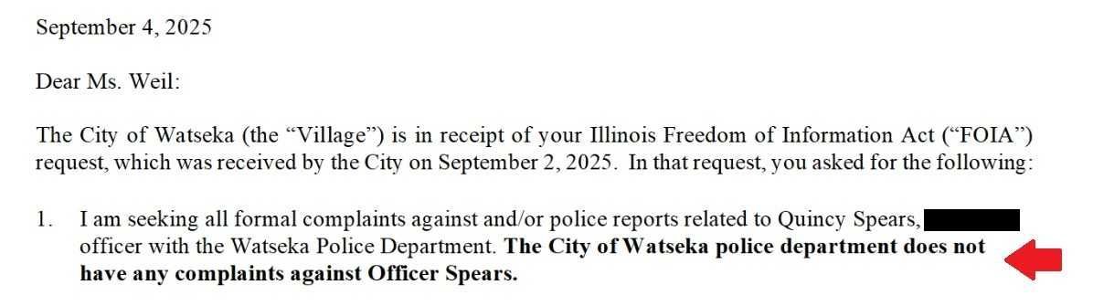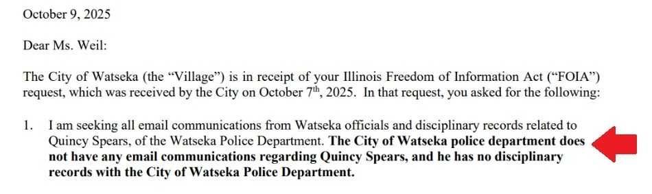 In response to public records requests, the City of Watseka told Blaze News on September 4 that its police department did "not have any complaints against Officer Spears." The city reiterated on October 9 that the police department did "not have any email communications regarding Quincy Spears" and that he had "no disciplinary records" there.
