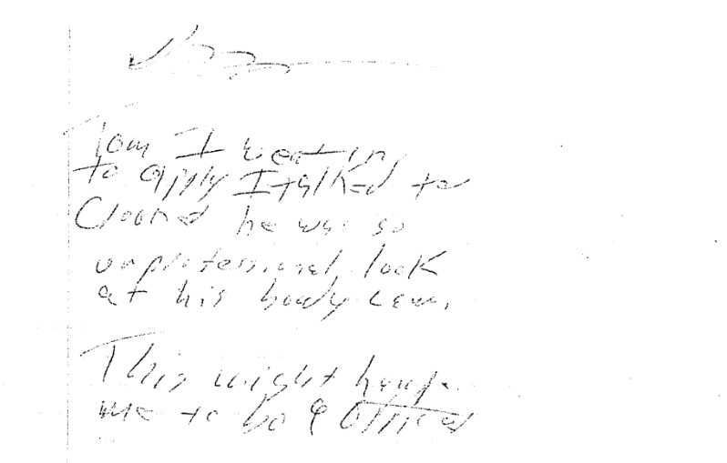 The note, aptly described as "difficult to understand," is believed to read: "Tom I went in to apply I talked to Crocker he was so unprofessional, look at his body cam. This might hurt me to be a officer."