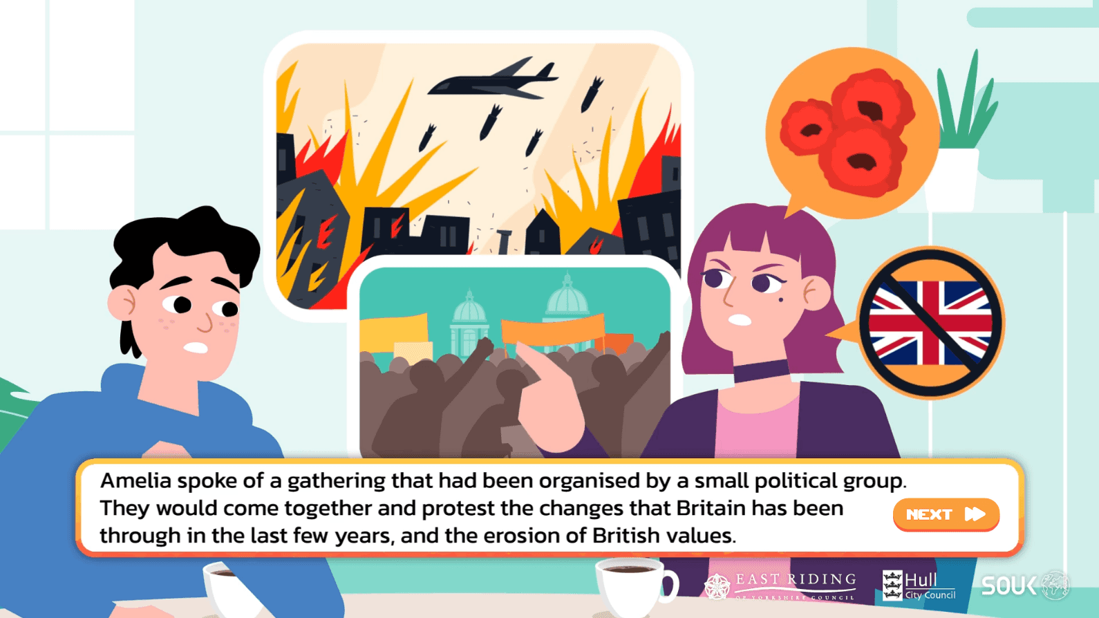 Amelia features prominently in the fourth scenario, where she is introduced as a close friend of Charlie who has "made a video encouraging young people in Birdlington to join a political group that seeks to defend English rights."
