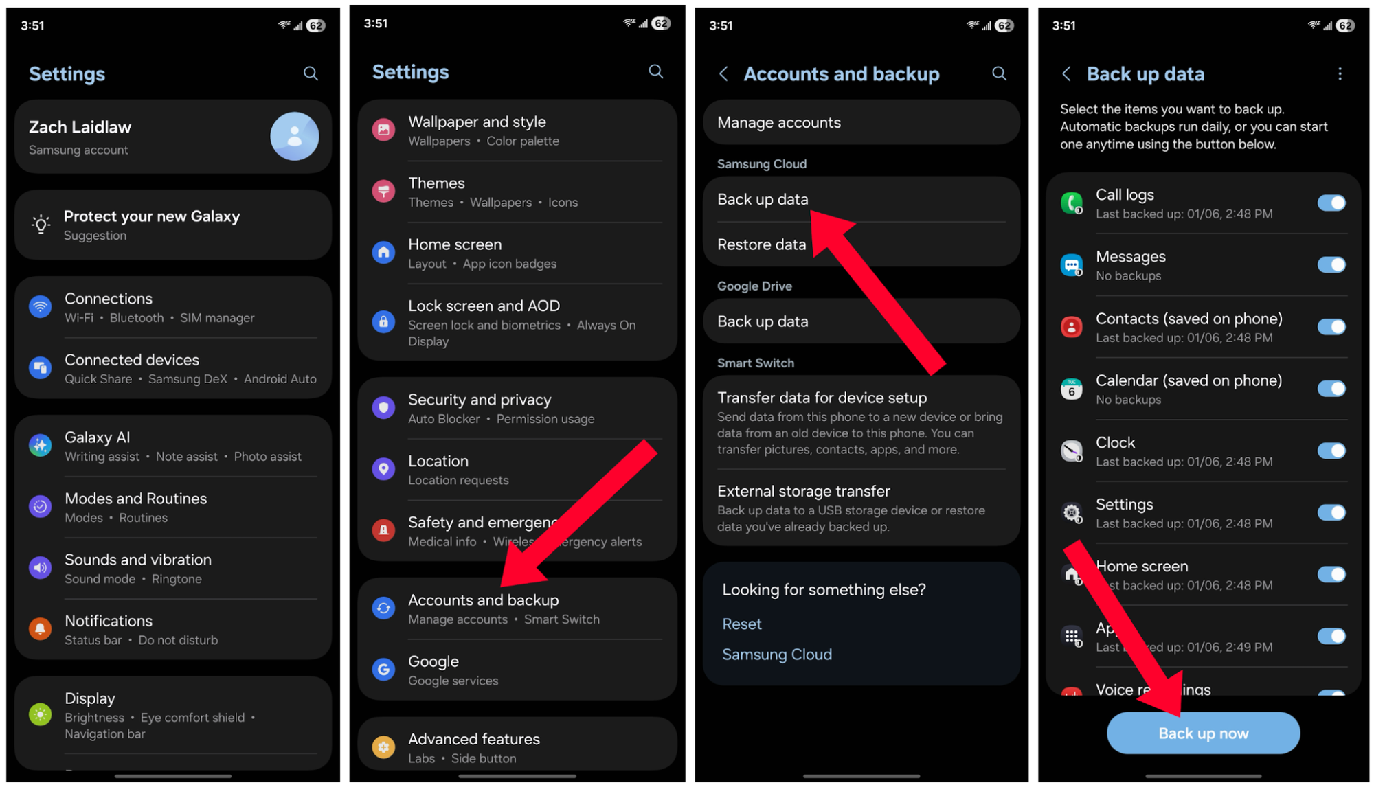 Google backup works perfectly fine on Samsung phones, but Galaxy owners need to take some extra steps to back up Samsung’s first-party apps. In order to save your call logs, messages, alarm clocks, voice recordings, home screen layouts, and settings, you need to enable Samsung Cloud via the following steps: