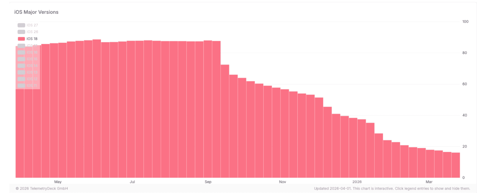 Many millions still run their iPhones on vulnerable operating systems.Chart via iOS 18 Marketshare 2026/TelemetryDECK