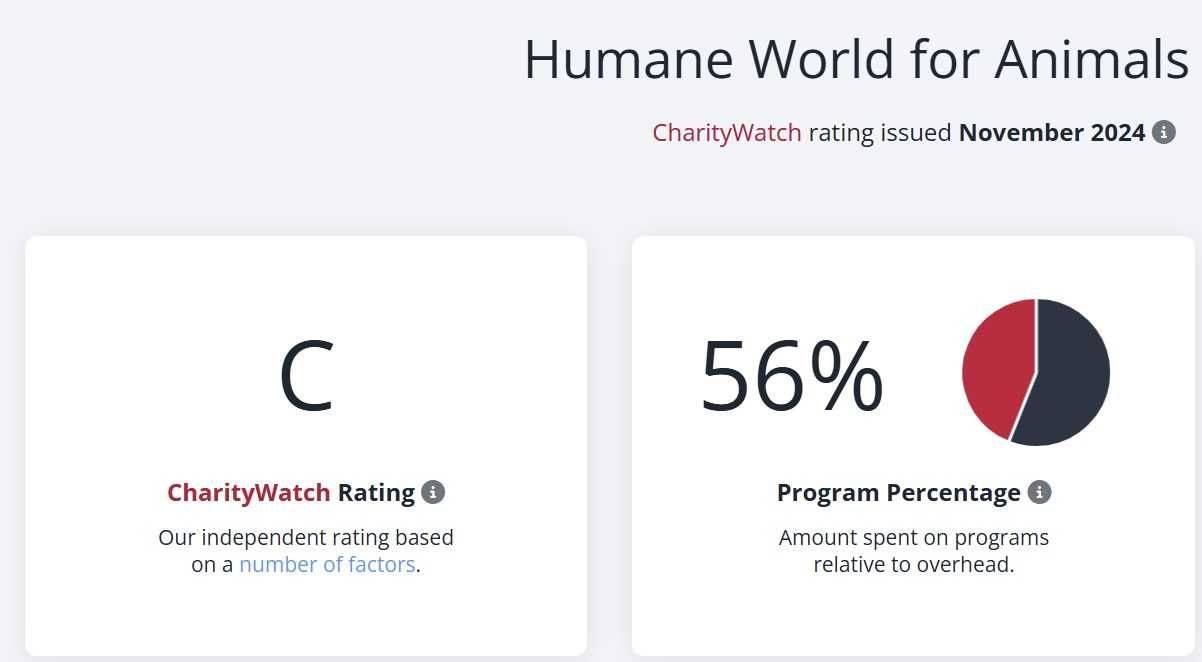And while CharityWatch has given both HWA (see above screenshot) and the ASPCA low marks for financial efficiency, Charity Navigator currently awards both organizations four-star ratings, with scores of 99% for the ASPCA and 98% for HWA.