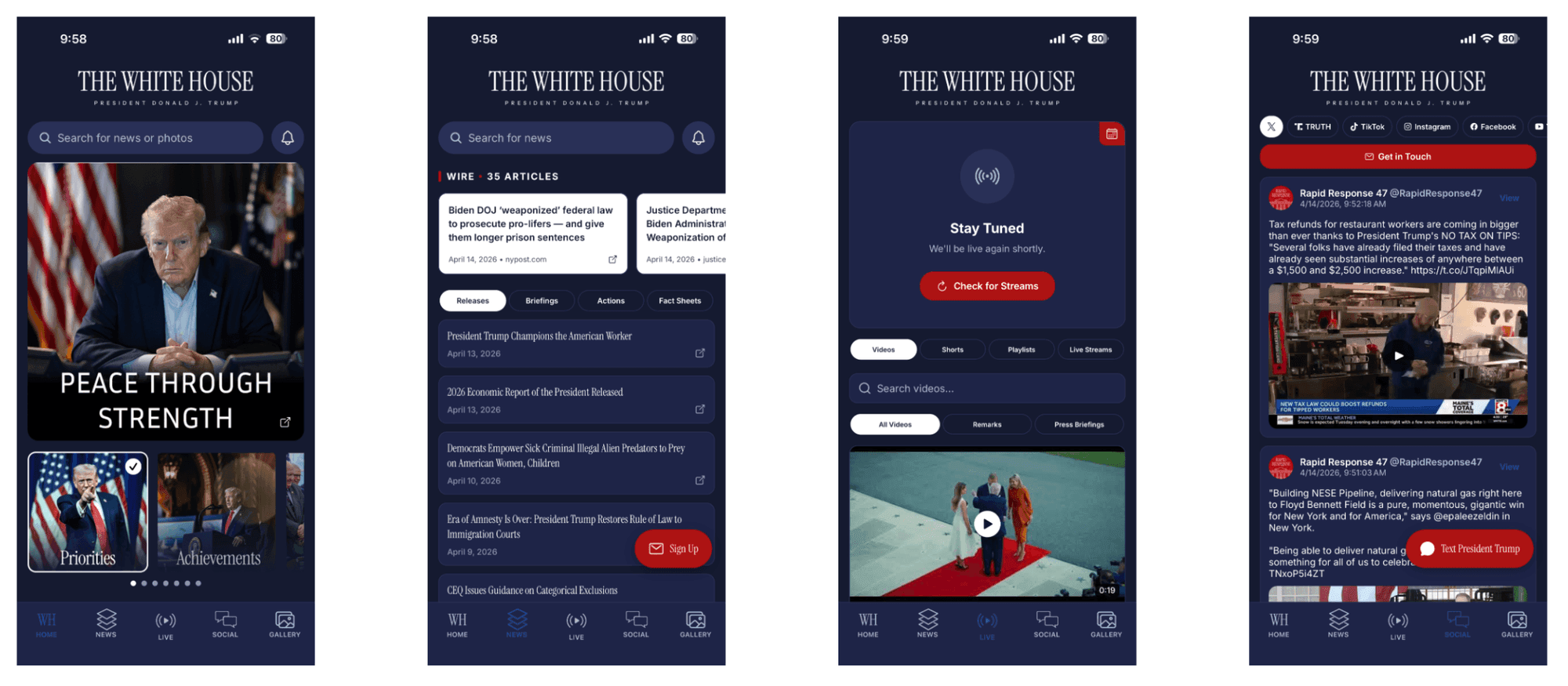 - Social: The social tab provides a live feed of various social media accounts connected to the president, including Rapid Response 47, the White House, and Donald J. Trump. There’s also a tab that lets you write to the White House, text President Trump himself, sign up for the White House newsletter, and you can even submit a tip to Immigration and Customs Enforcement if you suspect illegal immigration is taking place in your neighborhood or workplace.