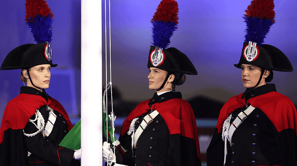 First, a very diverse cast of fans arrived at the stadium on a train before Armani-clad models in Italian colors delivered the Italian flag to the podium. Then, an "all-female honor guard," which NBC noted was the first of its kind for the Olympics, raised the flag.