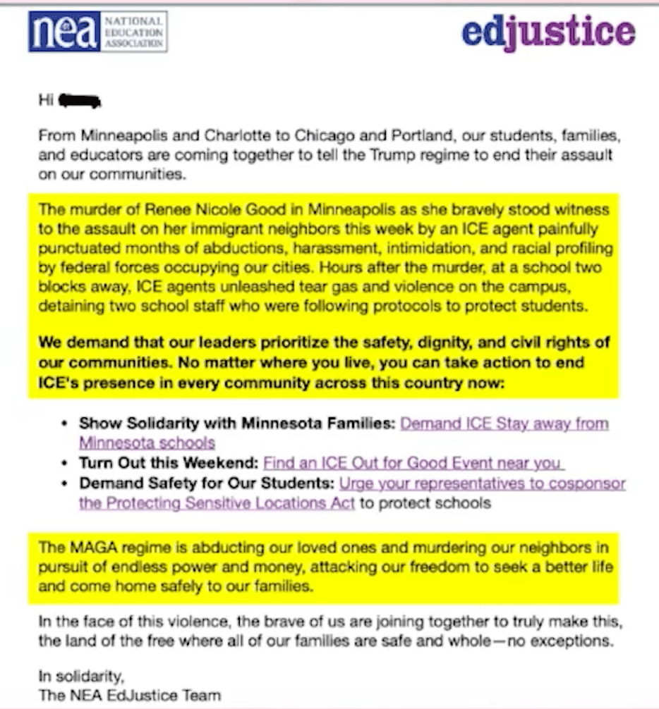 “This is a very pervasive issue,” Sara says, displaying the following memo recently distributed by the National Education Association arguing for increased anti-ICE activism.