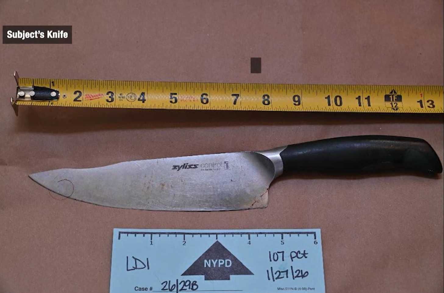 New York Police Department Officer Tyree White orders Chakraborty to “put the knife down” several times, video shows. Chakraborty, 22, does not comply.