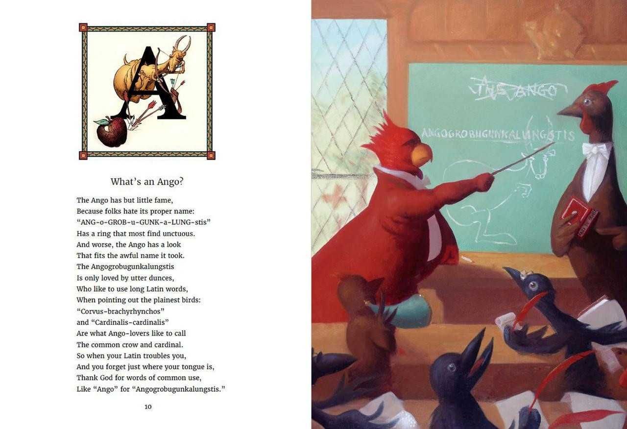 I did it as a kind of nod to Chaucer, whose first published work of all time was an abecedarian. It was a good, simple structure. I could do the letter blocks for the little people, and each one of the letter blocks had funny alliterative tricks. These and the illustrations were very fun for littles. But then there was higher matter happening, both in some of the poems and the glossary for the adults. So there was sort of deeper matter for adults to seize on to.
