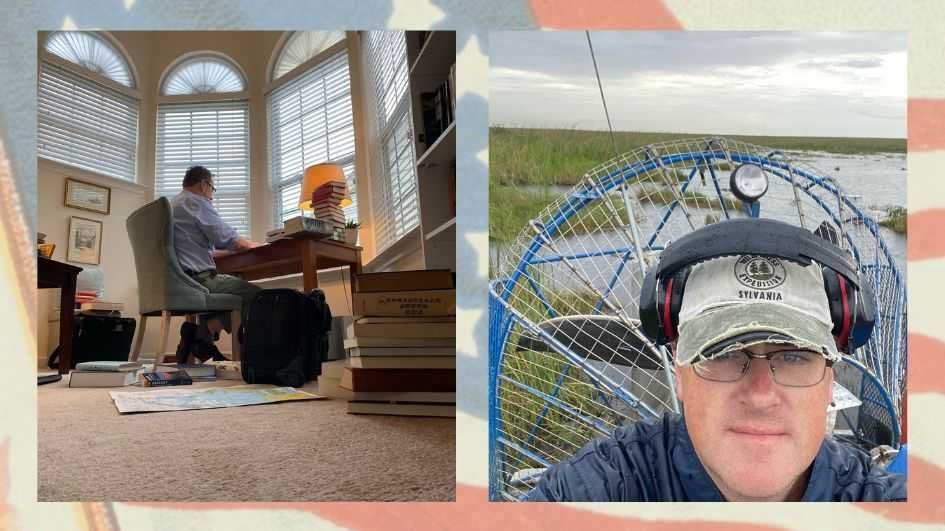 The whole book follows one particular funny fellow, Hugh Manatee, who starts in the Everglades, and he transports his heavy bulk by all various manners of technological, very American developments around the entire country.
