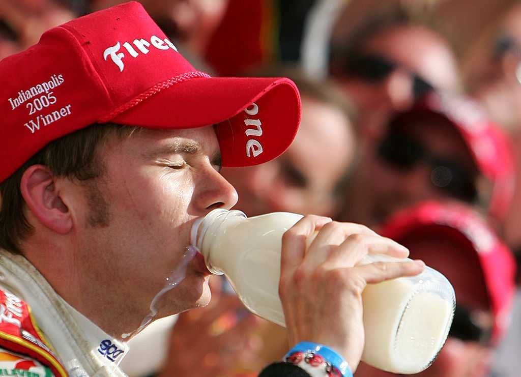 Dan Wheldon celebrates his winning of the 89th Indianapolis 500 by drinking milk. Photo by Donald Miralle/Getty Images