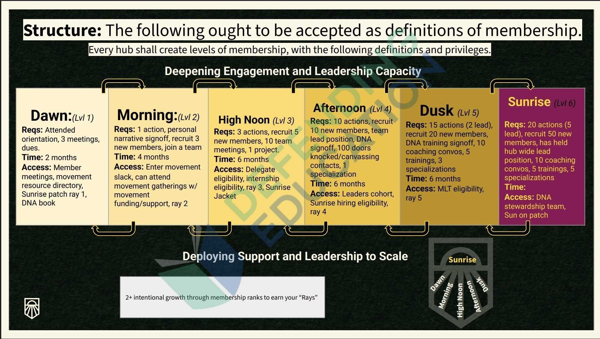 Members also earn “rays” on a Sunrise patch as they progress through the ranks — a visible marker of participation and standing within the organization. The structure resembles a formal pipeline, designed to scale participation and develop organizers over time.