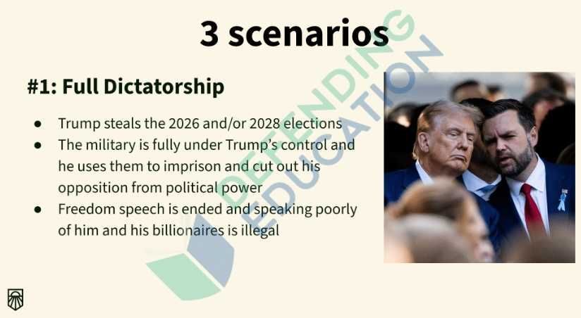 The most extreme — “Full Dictatorship” — imagines Donald Trump consolidating power, using the military against opponents, and restricting speech.