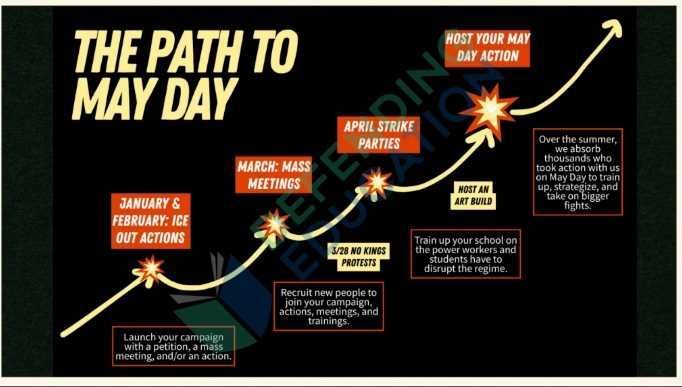 It begins with a March 28 No Kings event and builds toward a May 1 national strike. In between: sustained pressure.