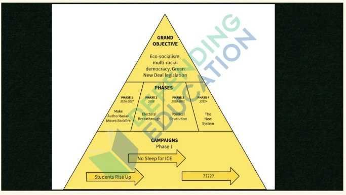 But slides leaked to Defending Education from a March 17, 2026, membership meeting reveal a highly structured and strategic operation calling for a “political revolution” and “structurally chang[ing] the foundations of this country" — language that goes well beyond climate advocacy.