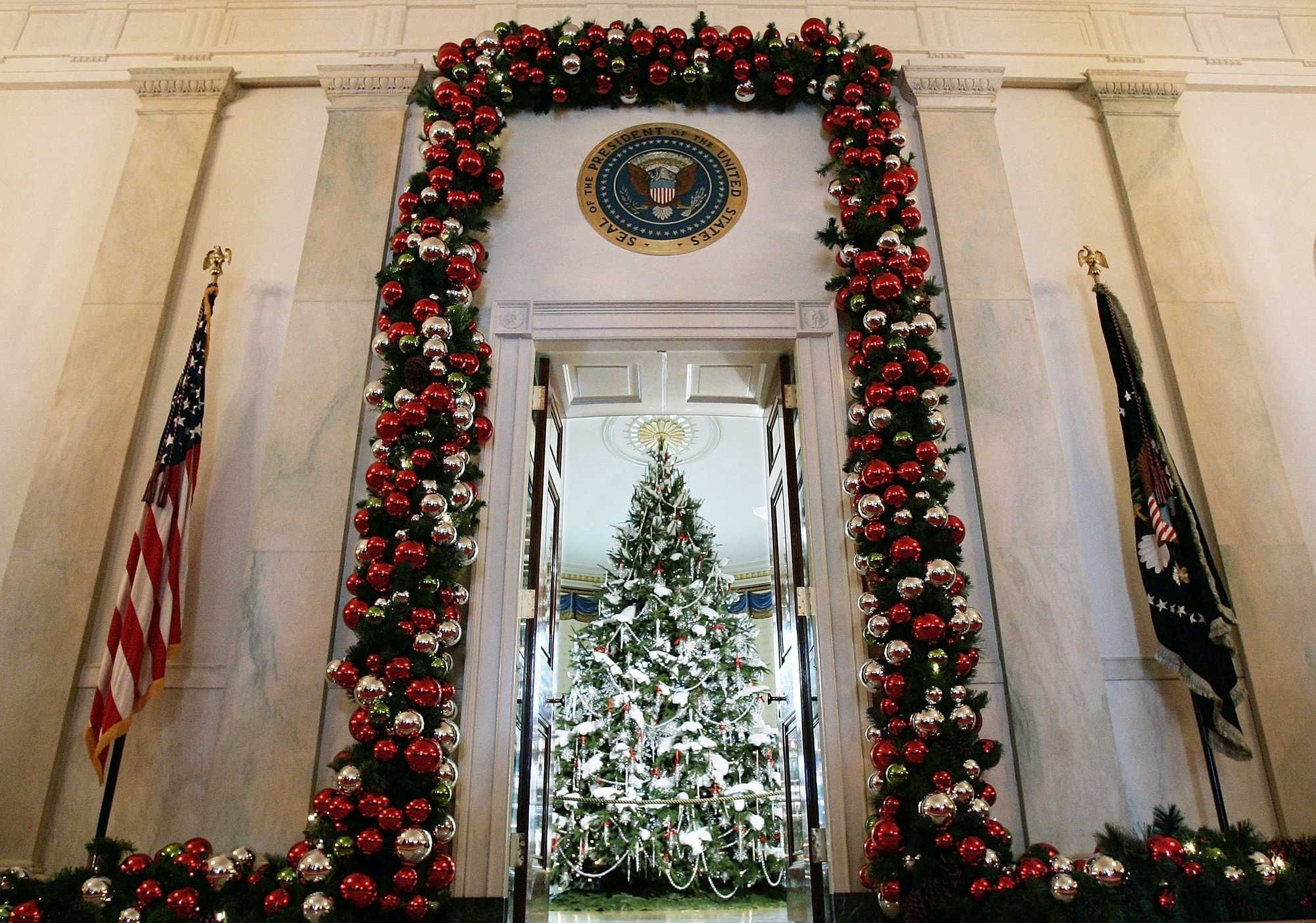 Similar trees were found throughout the halls of the White House beside bold garlands of red and silver ornaments consistent with the tree's color palette.